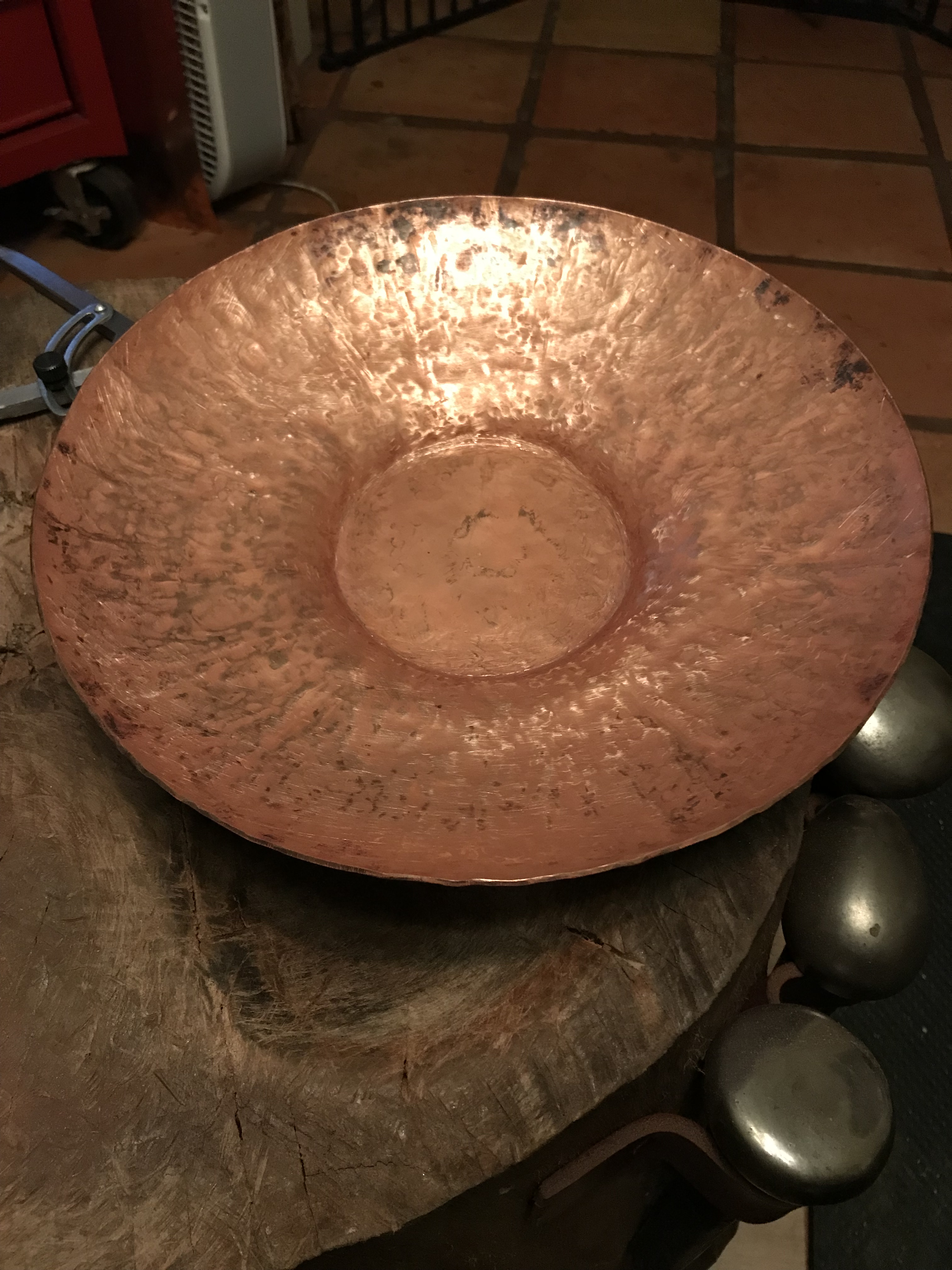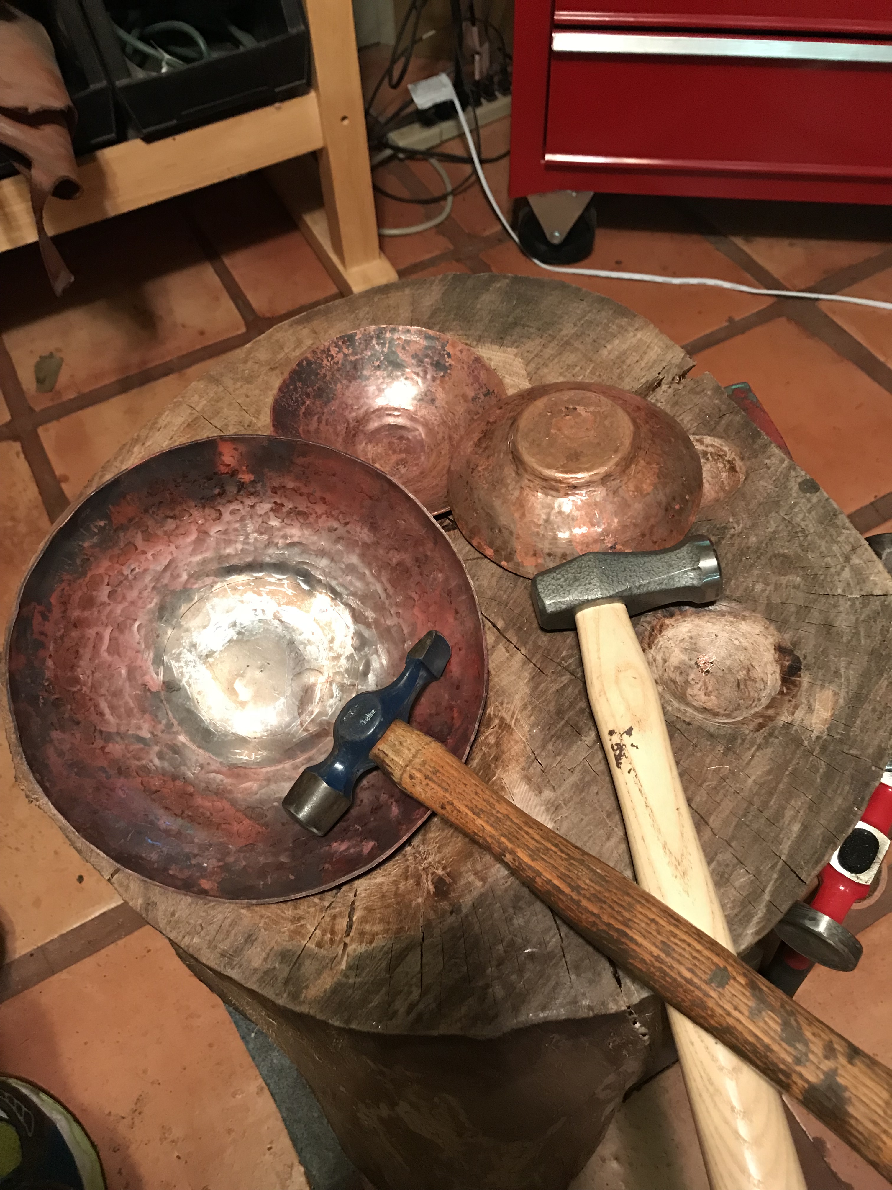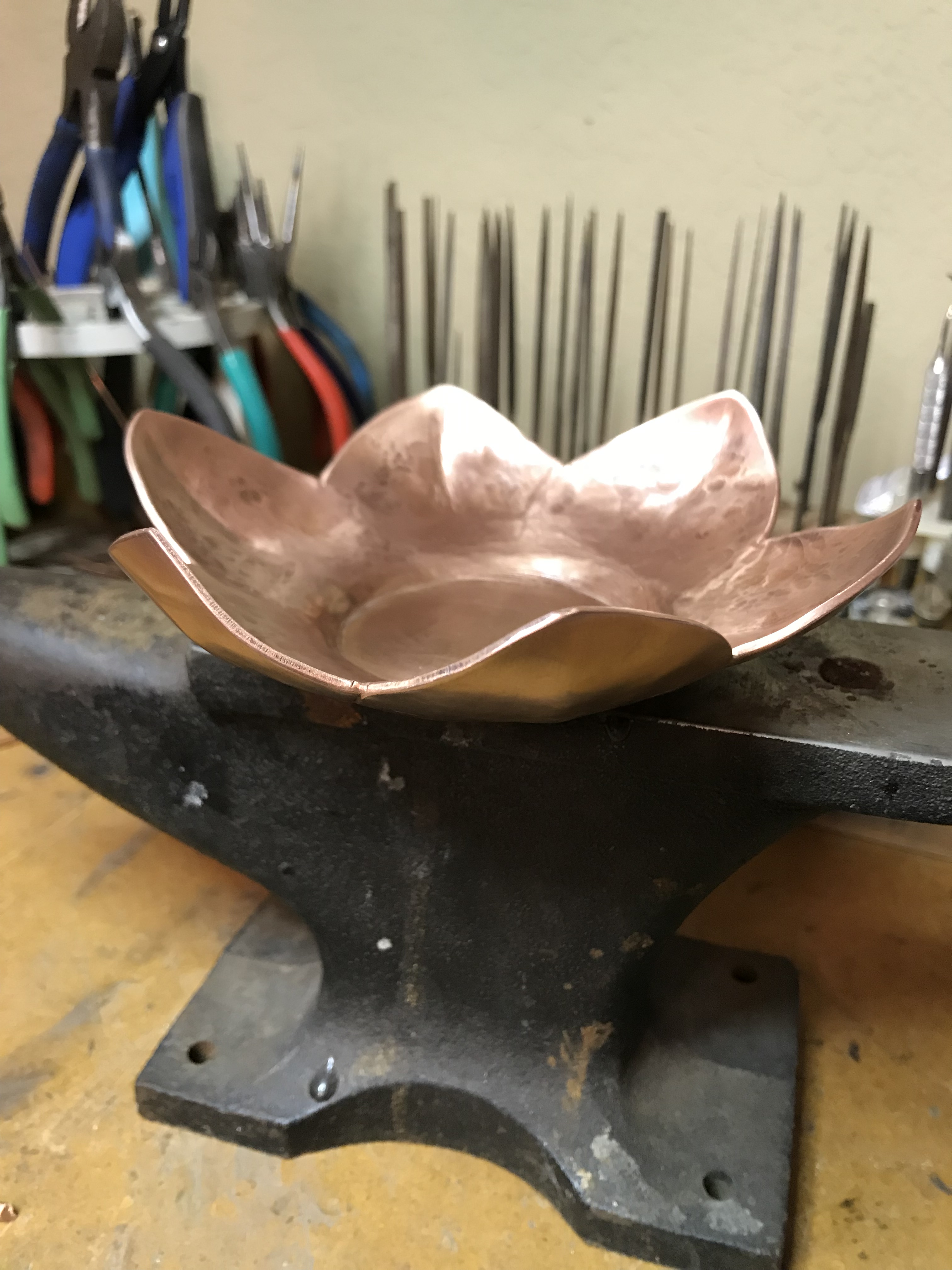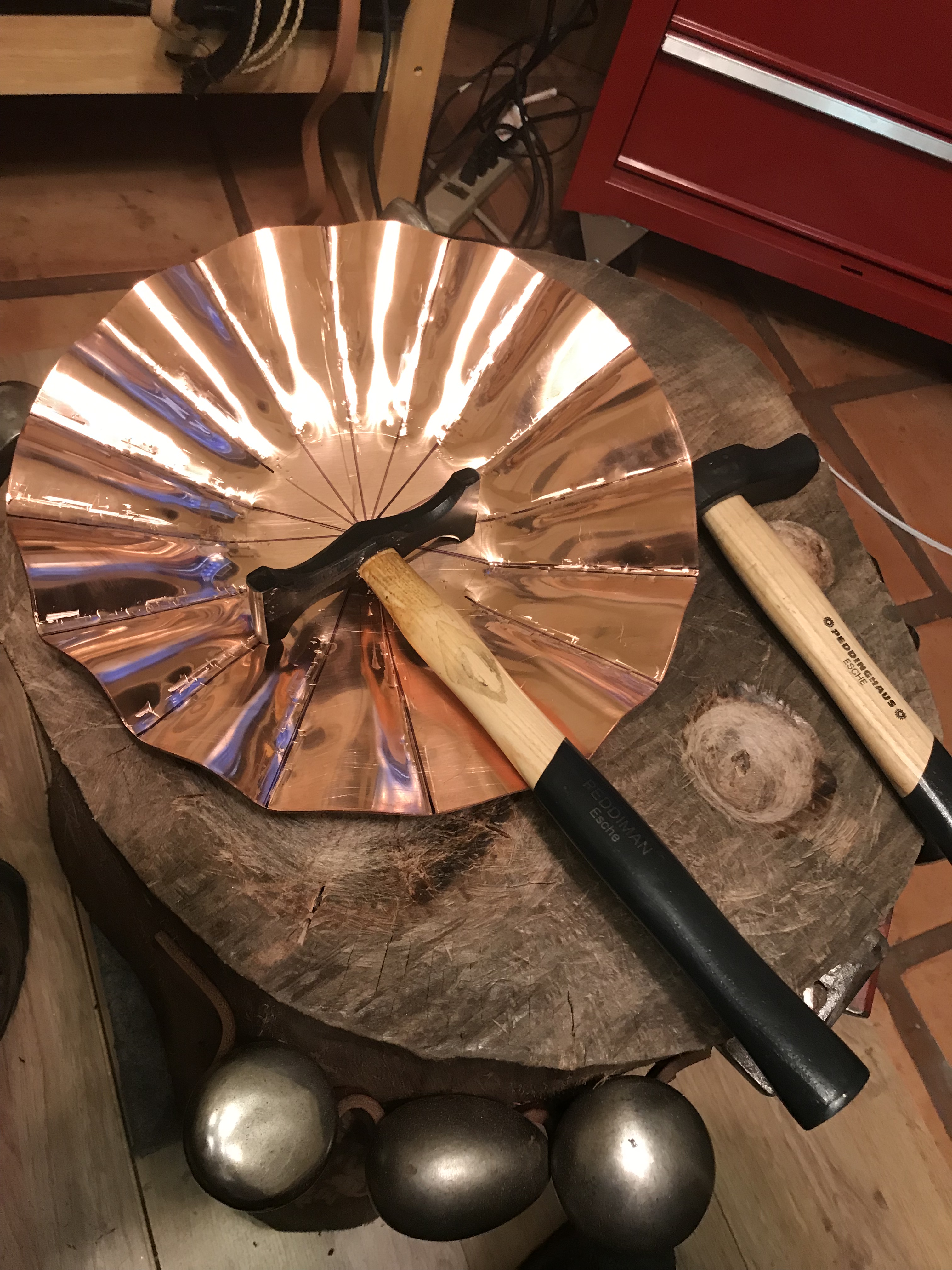 Works in progressEDC knivesNeckpiece: Enameled copper and sterling silverNeckpiece: Hammered copper and sterling silverSterling silver salt cellarWork in progress: 8″ chef’s knife from reclaimed sawmill bladeWork in progress: 12″ raised copper bowl12: copper bowlCopper lotus bowl 6″Leather worker’s round knife6″ copper lotus bowl chemical patinaEnameled salt cellars with copper spoonWorks in progressRaised copper bowl April 2018Steel lotus bowl6″ enameled bowl