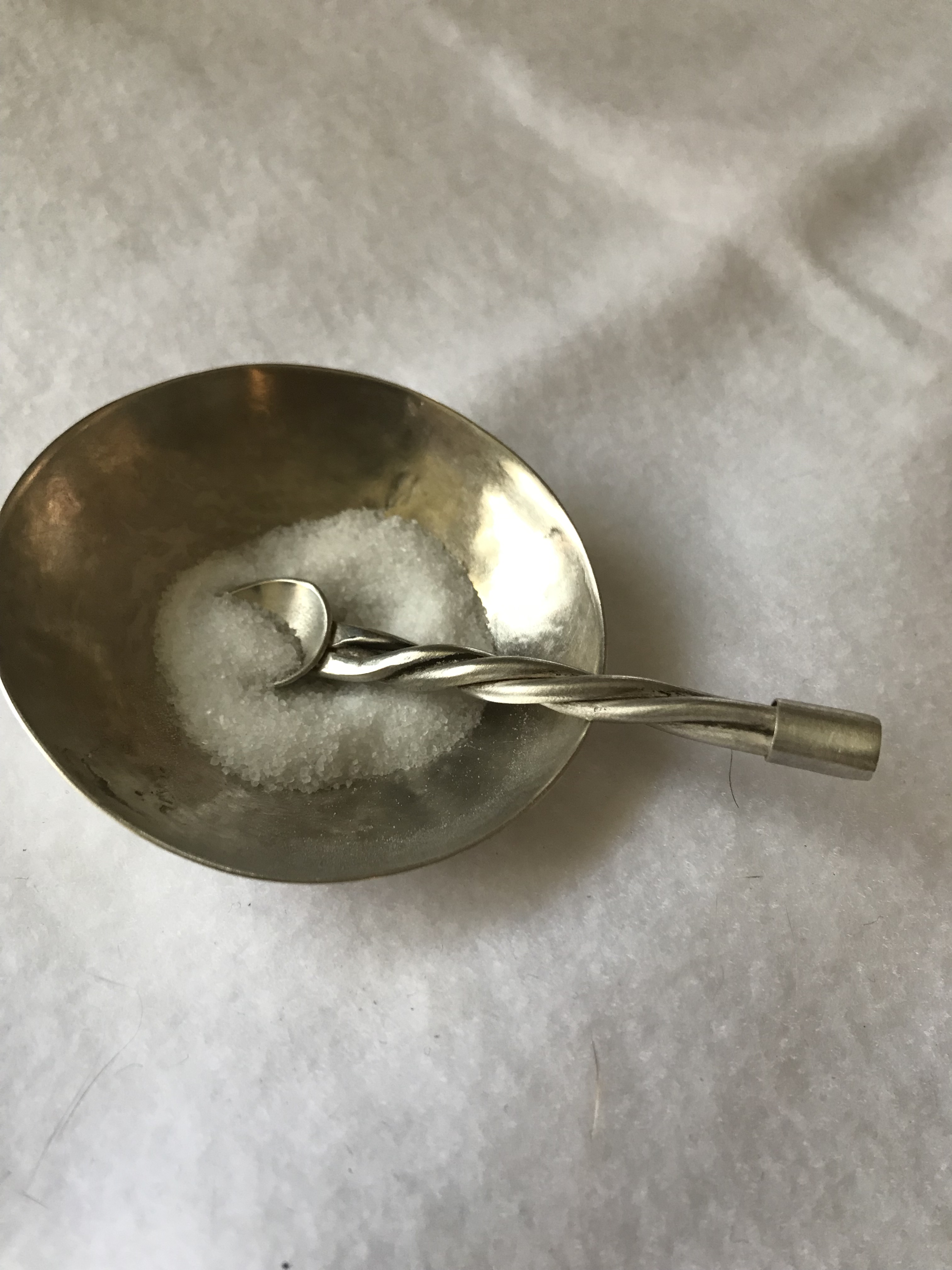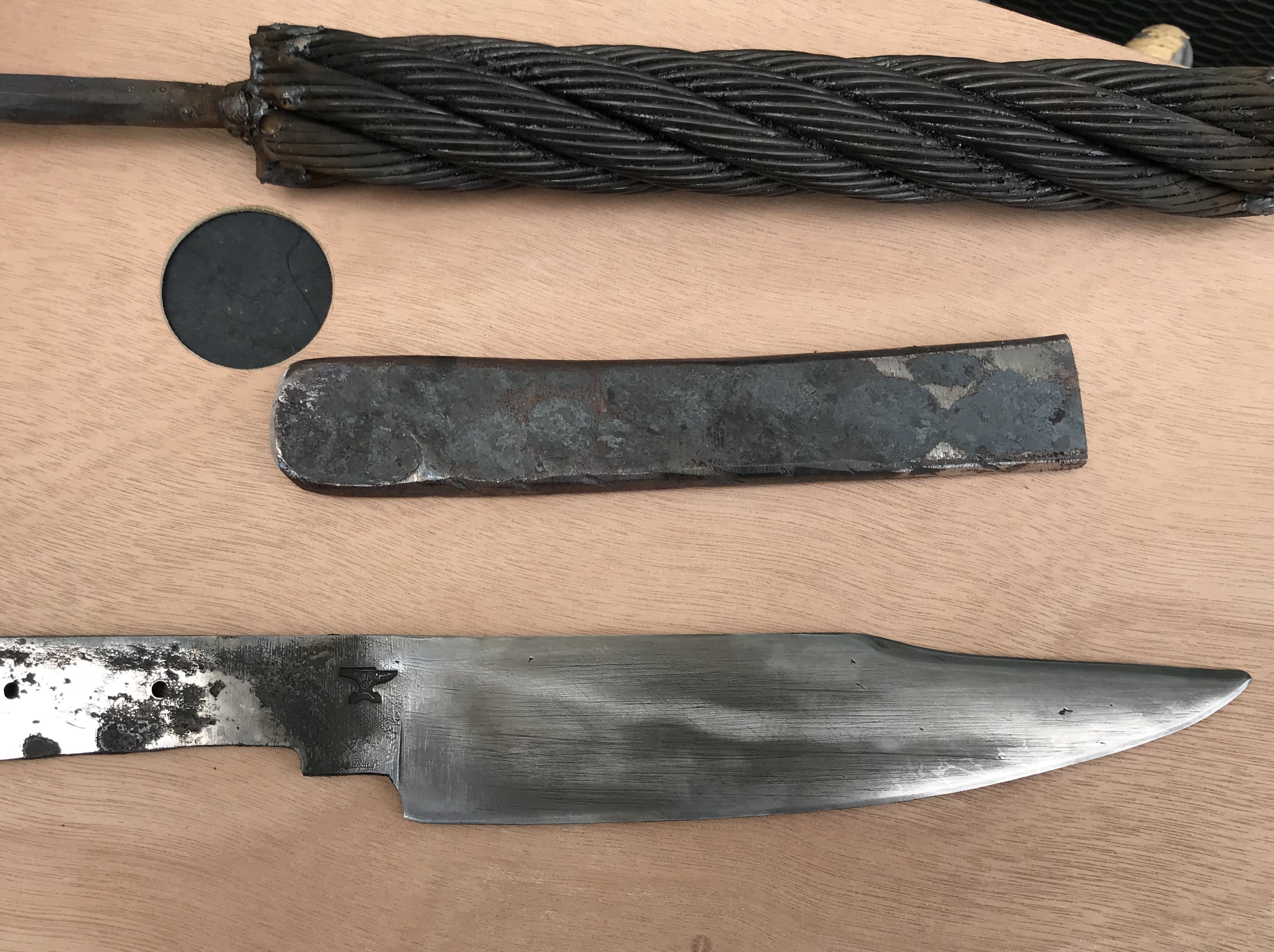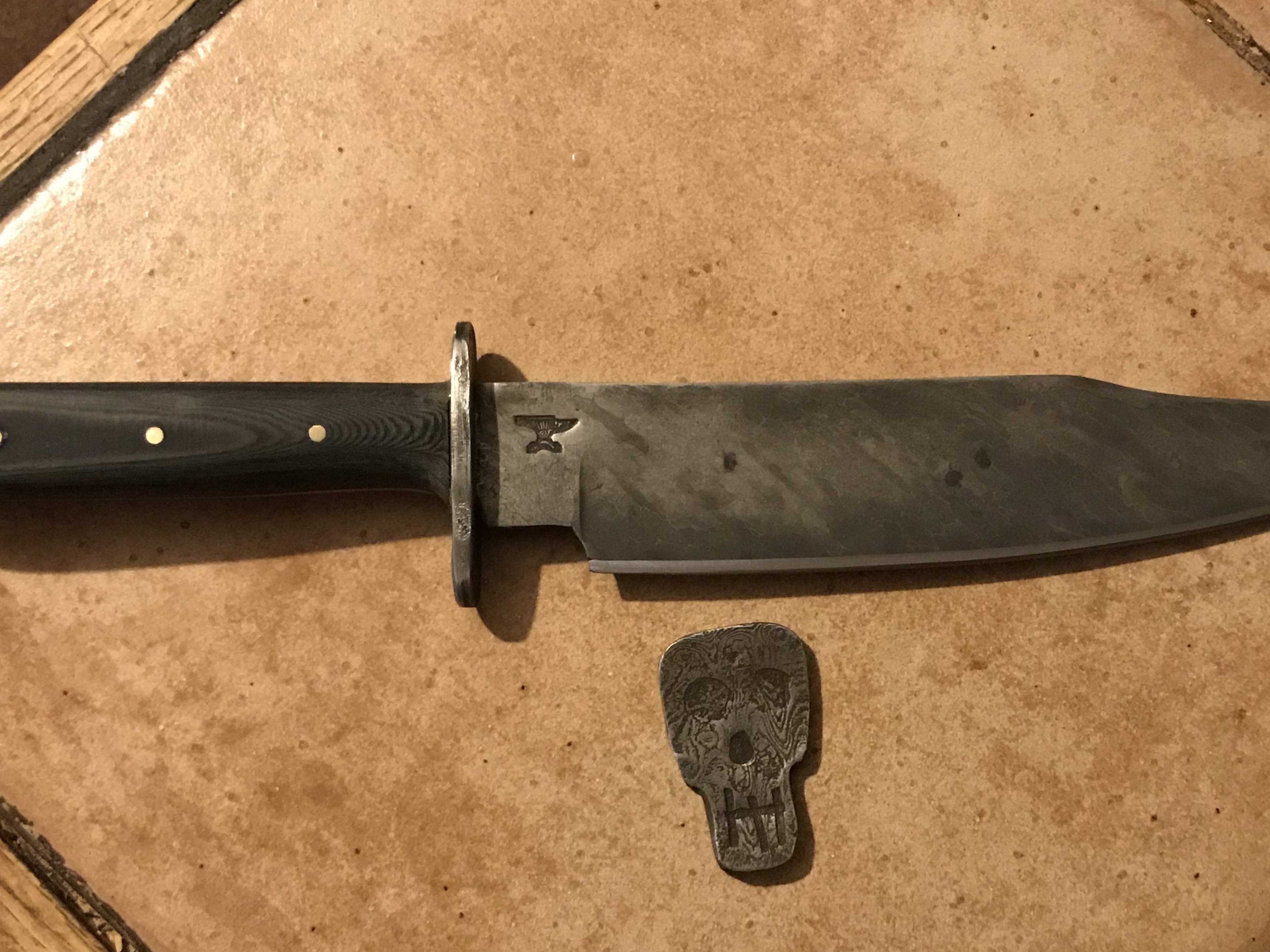 Big Bowie knife forged from 1 1/2″ crane cable, Damascus guard and micarta scales. Shown with a Damascus pocket skull.The process: Crane cable to forged billet to rough forged knife.6″ footed bowl with half round rim in sterling silver. Approximately 6 ounces total weight.
